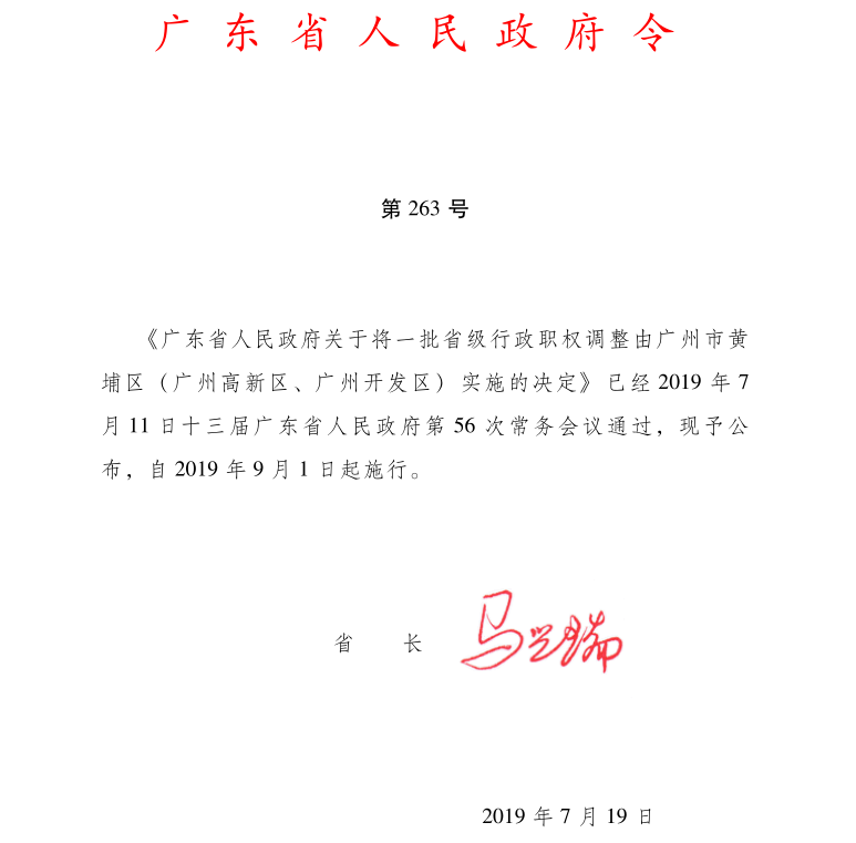 廣東省人民政府關于將一批省級行政職權 調整由廣州市黃埔區(qū)(廣州高新區(qū)、 廣州開發(fā)區(qū))實施的決定