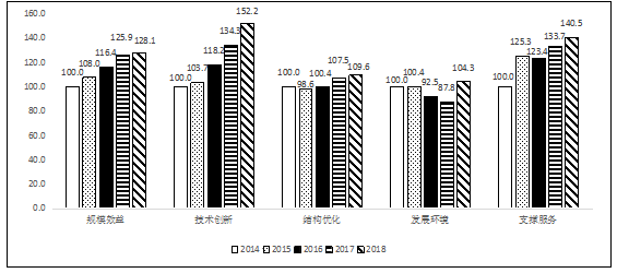 其中,一級指標中技術創新指數與發展環境指數提升最快,分別達到152.2104.3,上升幅度為17.9個和16.5個分值,對全國綜合發展指數上升的貢獻率達52.6%23.3%,拉動作用突出,其他三個指標也實現穩步提升(見表1)。