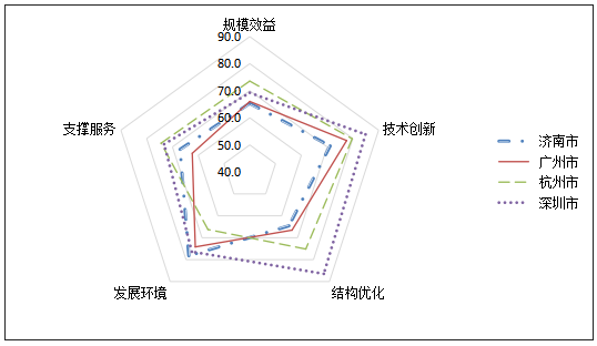 本年領先省份綜合發展指數均值為73.8,比上年上升2.5個分值,技術創新指數增長突出,廣東省綜合得分最高;中間省份綜合發展指數均值73.5,比上年上升3.4個分值,規模發展指數增長較快,安徽省綜合得分最高;潛力省份綜合發展指數均值65.0,發展環境指數增幅相對較快,山西省綜合得分最高;重點城市綜合發展指數均值69.0,比上年提高0.8個分值,支撐服務指數增幅突出,深圳市綜合得分最高。