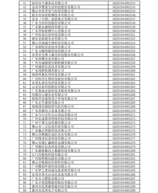 關于廣東省2019年第二批高新技術企業備案的復函