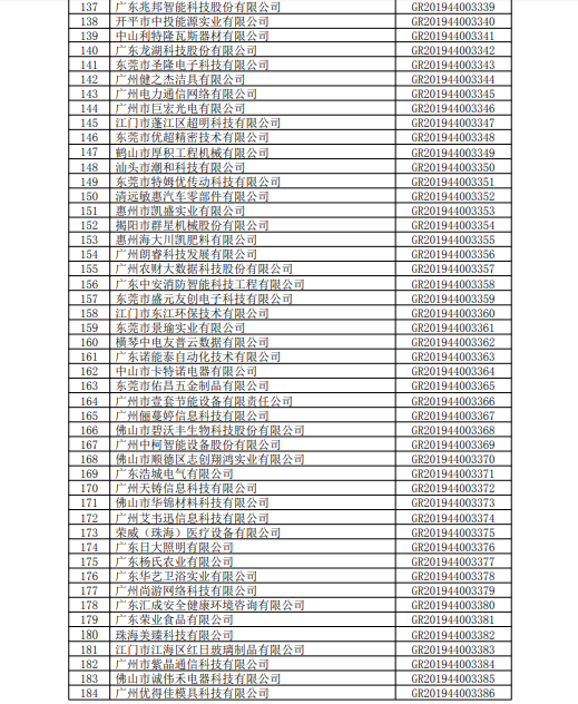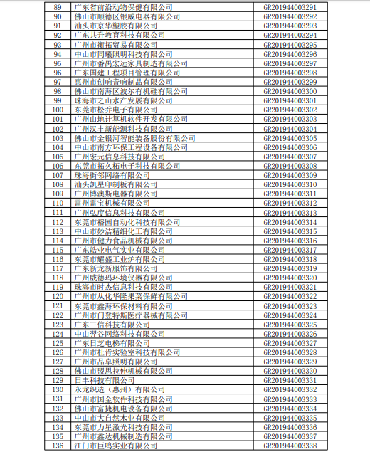 你們上報的《關于廣東省2019年高新技術企業認定備案的函》(粵科函高字〔20191730號)收悉。現將公示無異議的廣州市拓為鋁制品有限公司等4090家企業予以高新技術企業備案。請你們按照《廣東省2019年第二批高新技術企業名單》(詳見附件)中的企業名稱、高新技術企業證書編號和發證日期打印并頒發“高新技術企業證書”。
