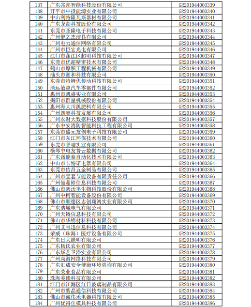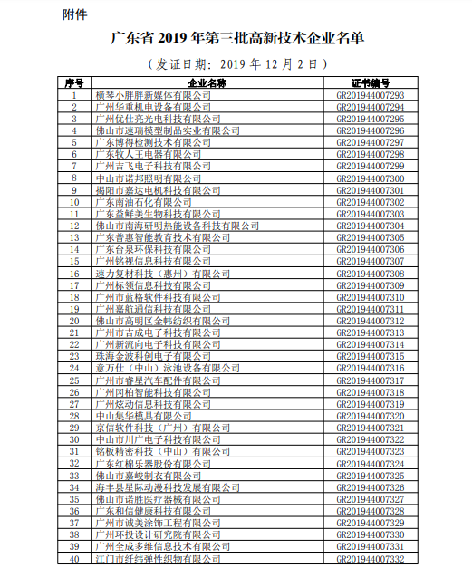你們上報的《關于廣東省2019年高新技術企業認定備案的函》(粵科函高字〔20191730號)收悉。現將公示無異議的橫琴小胖胖新媒體有限公司等3236家企業予以高新技術企業備案。請你們按照《廣東省2019年第三批高新技術企業名單》(詳見附件)中的企業名稱、高新技術企業證書編號和發證日期打印并頒發“高新技術企業證書”。