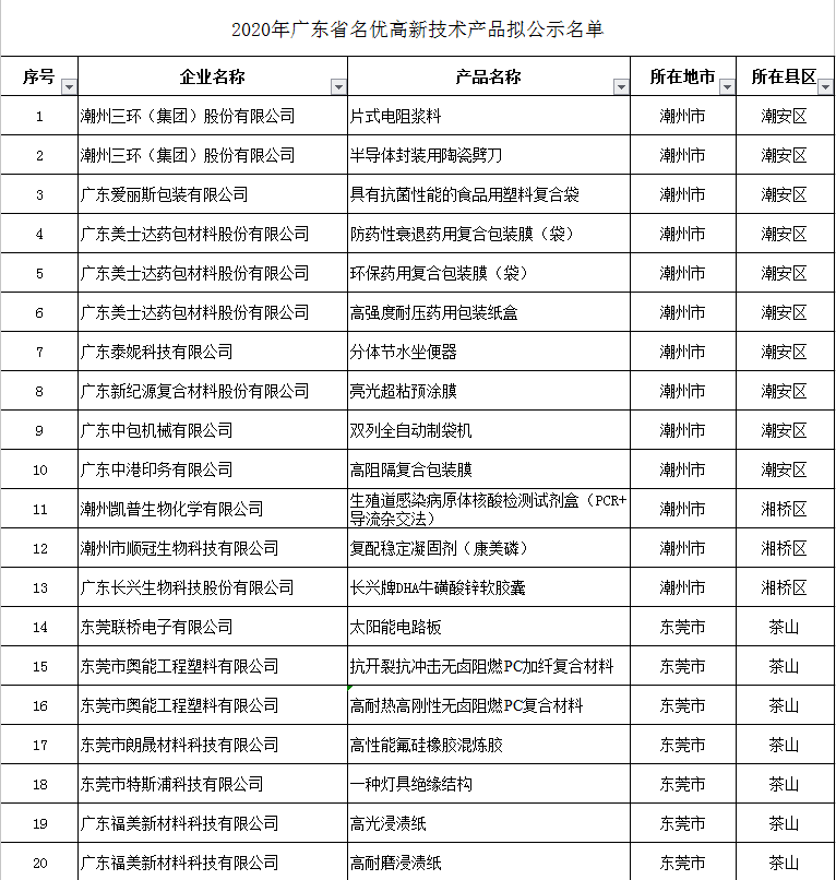 官方公示文件,全部名單點擊關于2020年廣東省名優高新技術產品擬通過評選名單的公示下載。